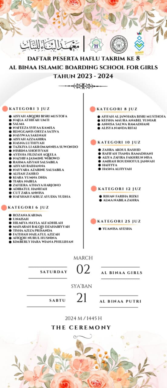 AL BINAA PUTRI – Alhamdulillah, berkat rahmat dan karunia Allah Subhanawata’ala kegiatan Haflu Takrim Al Qur’an ke 8 Al Binaa putri, telah dilaksanakan pada tanggal 02 Maret 2024 bertepatan dengan 21 Sya’ban 1445 H. Kegiatan ini dilaksanakan di Gedung Mustaqbal Pesantren Al Binaa dengan tema “BACAAN AL QUR’AN KU, PERISAI DI DUNIA, SYAFA’AT DI AKHIRAT”